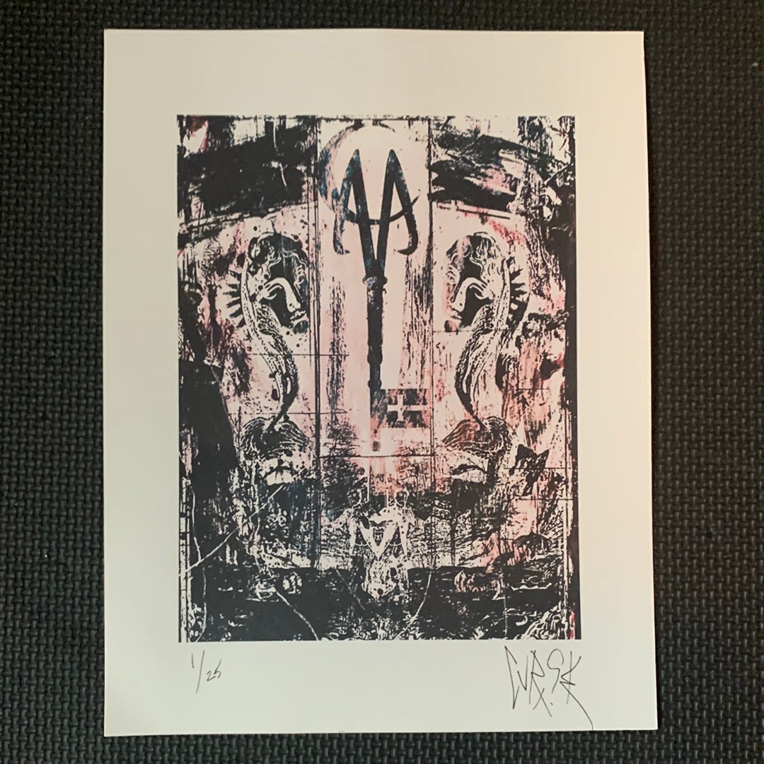 Based on the original painting created by Curse for his new album “IMMORAL ENPORIUM” this is a an inkjet print on French card stock, hand signed, individually numbered and embellished by Curse. Only 25 prints exist for this edition.